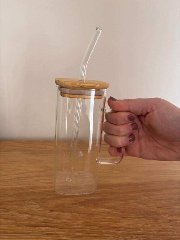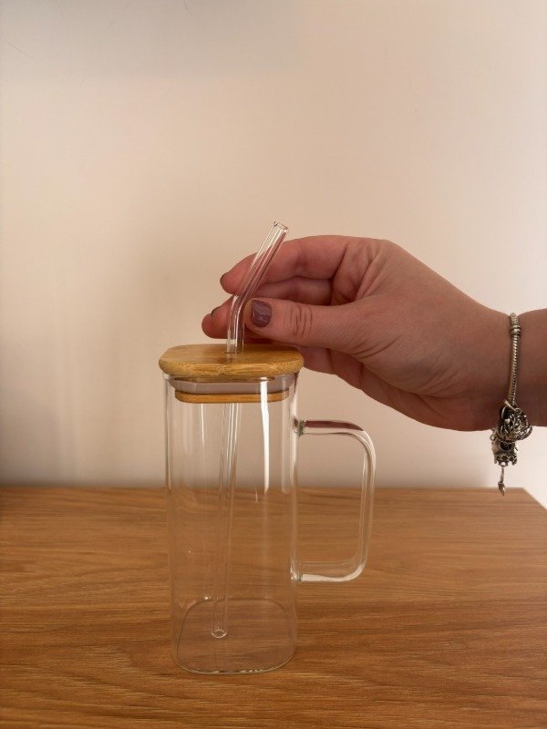 Vaso de vidrio cuadrado con asa y sorbete. Tapa de bamboo. Medidas: 14 cm x 6 cm. Capacidad 350 ml.